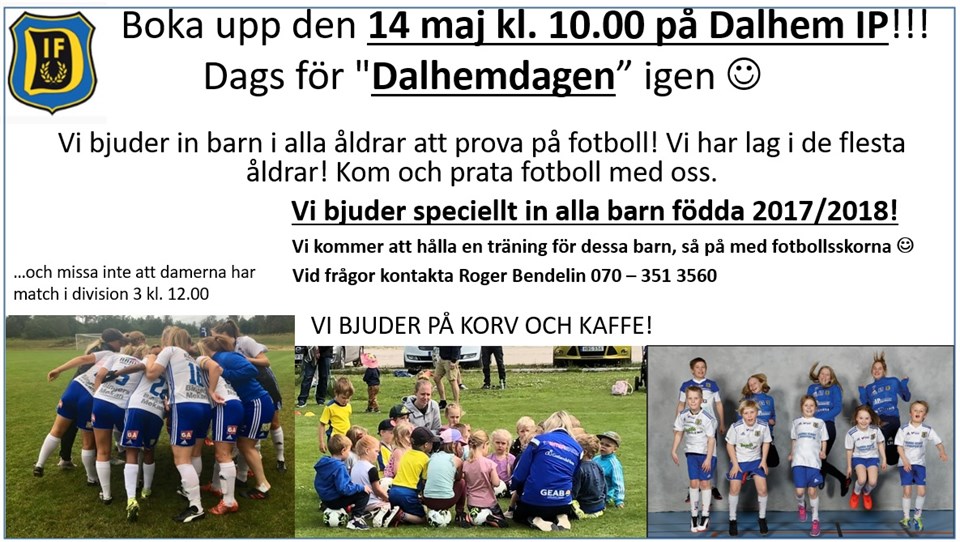 Dags för Dalhem IF:s fotbollskola!!!! Sista anmälningsdag den 4/6 Läs mer om fotbolslskolan Dalhem IF 14 maj 2023 1kommentar